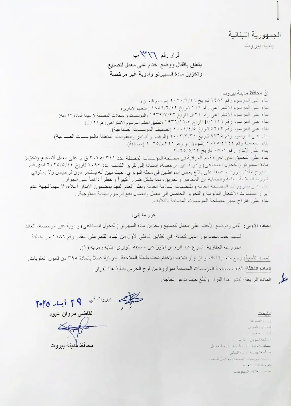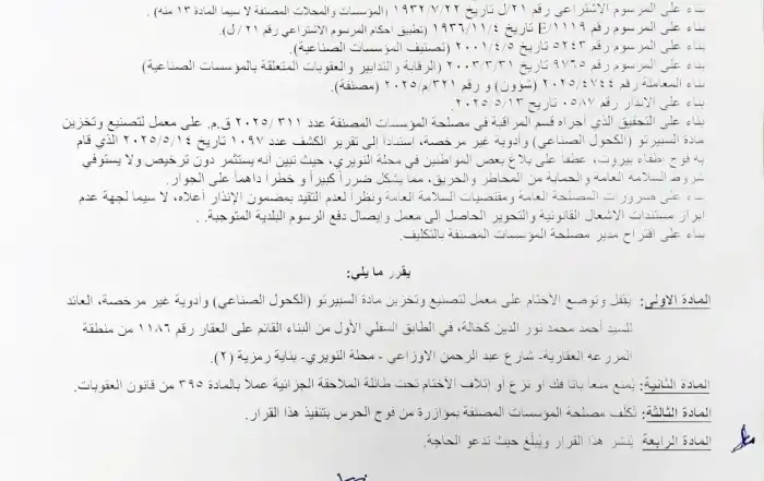 Beirut24 Admin2025-06-03T13:33:26+03:00قرار لمحافظ بيروت بإقفال معمل لتصنيع السبيرتو وأدوية غير مرخصةBeirut24 Admin2025-06-03T13:33:26+03:003 حزيران 2025|