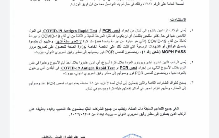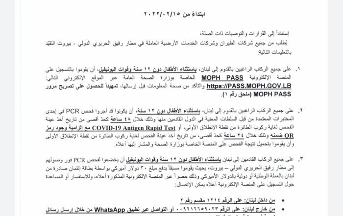 Samira mnayyar2022-02-06T23:07:02+02:00تعميم حول الإجراءات المتعلقة بالركاب القادمين إلى لبنان ابتداء من 15 شباطSamira mnayyar2022-02-06T23:07:02+02:006 شباط 2022|