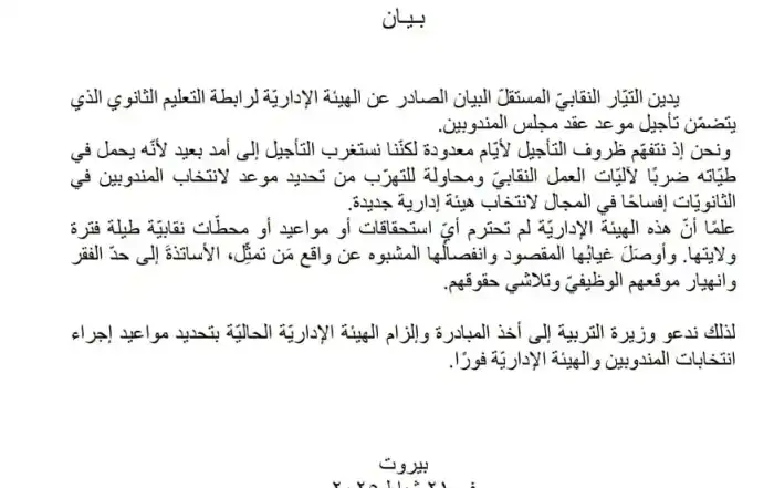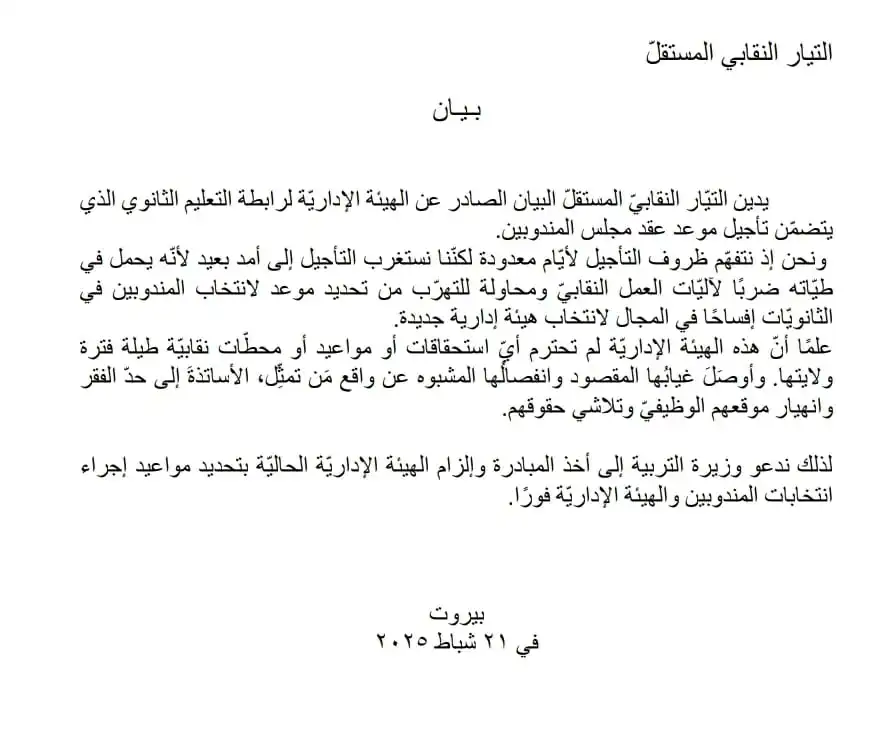 Samira mnayyar2025-02-22T09:35:18+02:00التيار النقابي المستقل يدعو وزيرة التربية لاتخاذ المبادرةSamira mnayyar2025-02-22T09:35:18+02:0022 شباط 2025|