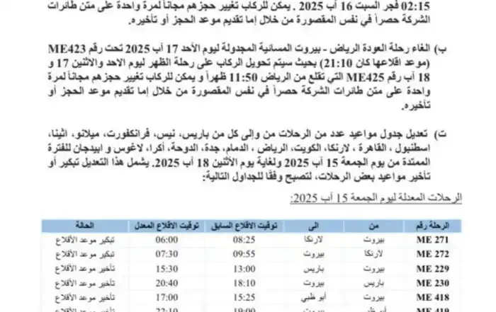 Beirut24 Admin2025-08-12T11:31:07+03:00تعديل جدول بعض الرحلات في طيران الشرق الاوسطBeirut24 Admin2025-08-12T11:31:07+03:0012 آب 2025|