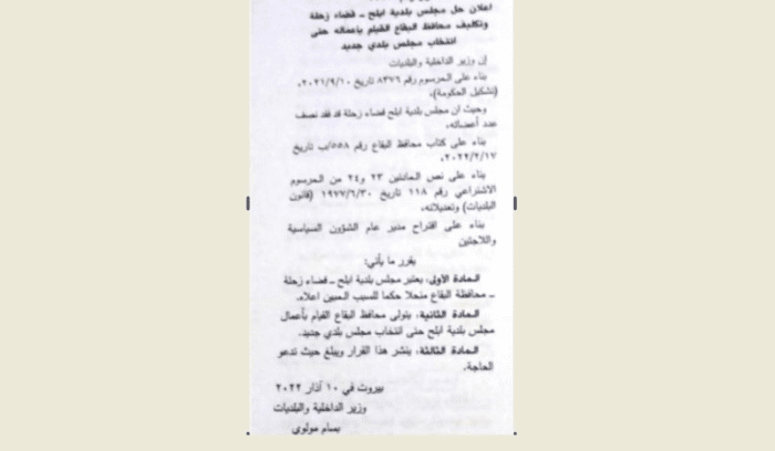 “المادة الأولى: يعتبر مجلس بلدية أبلح – قضاء زحلة – محافظة البقاع منحلا حكما بسبب فقدان المجلس نصف اعضائه.
