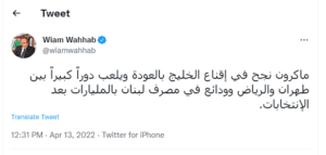 “ماكرون نجح في إقناع الخليج بالعودة ويلعب دوراً كبيراً بين طهران والرياض وودائع في مصرف لبنان بالمليارات بعد الإنتخابات”.