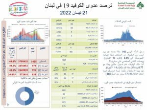 أعلنت وزارة الصحة العامة في تقريرها اليومي تسجيل “140 إصابة جديدة بفيروس كورونا رفعت العدد التراكمي للحالات المثبتة الى 1096099، كما تم تسجيل حالتي وفاة”.