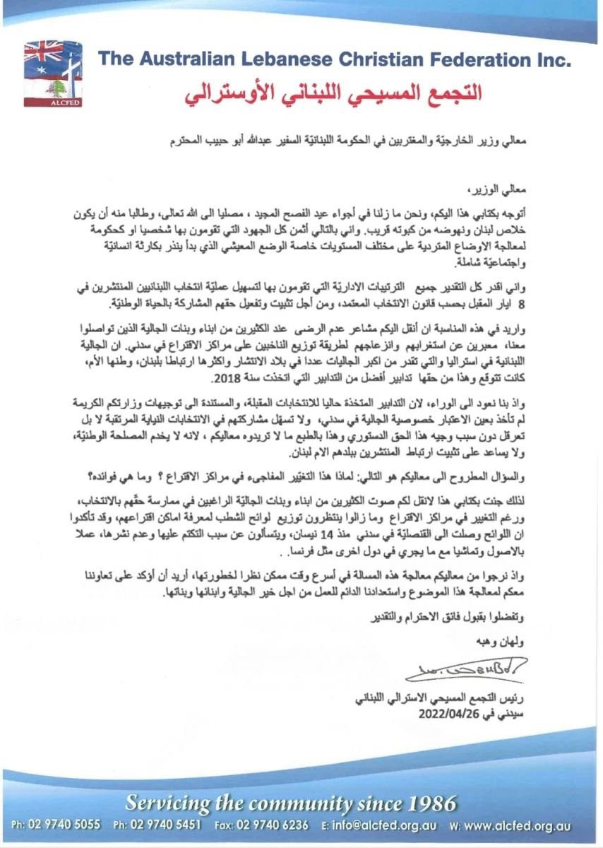 وجاء في نص الكتاب الموجّه من رئيس التجمع المسيحي الأسترالي الى وزير الخارجية اللبناني ما يلي: