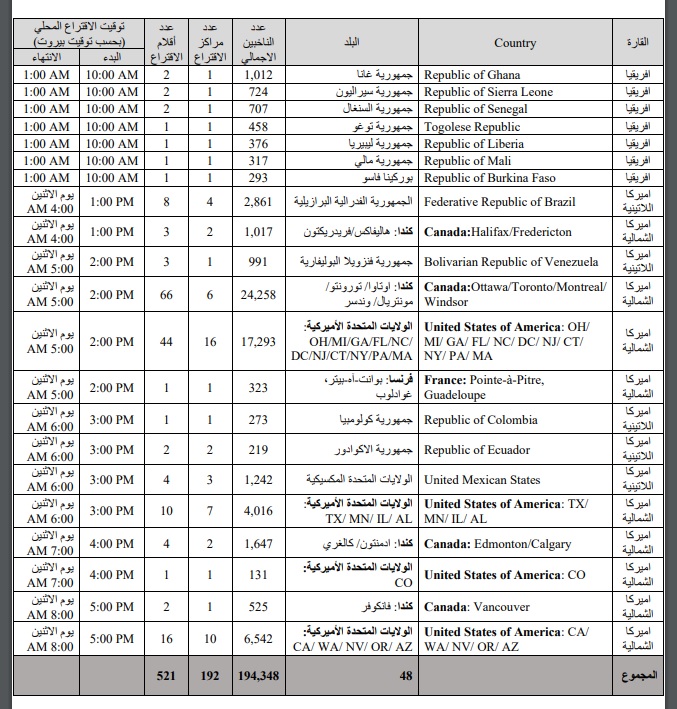 ومن المفترض ان يقترع الجمعة 13239 ناخباً مسجلاً في السعودية، و7340 في قطر، 5788 في الكويت و 1010 في سوريا، 901 في سلطنة عمان، 708 في مصر، 637 في البحرين، 645 في ايران، 498 في الاردن، و330 في العراق.