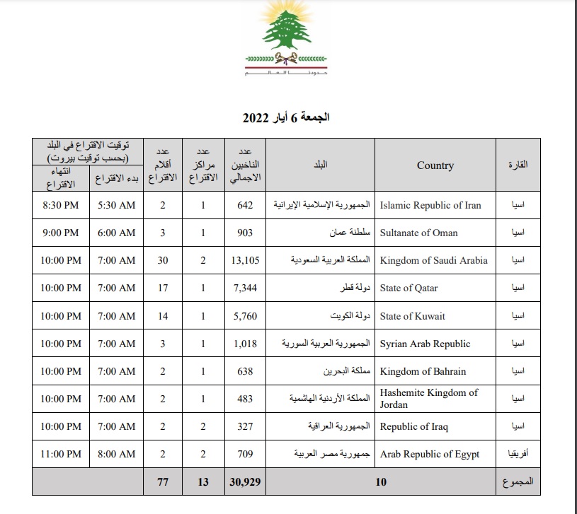 تبدأ اليوم الجمعة المرحلة الأولى من الانتخابات النيابية ويفتتح المغتربون اللبنانيون عملية الاقتراع في الدول العربية باستثناء الإمارات العربية المتحدة.