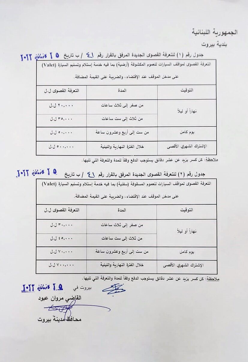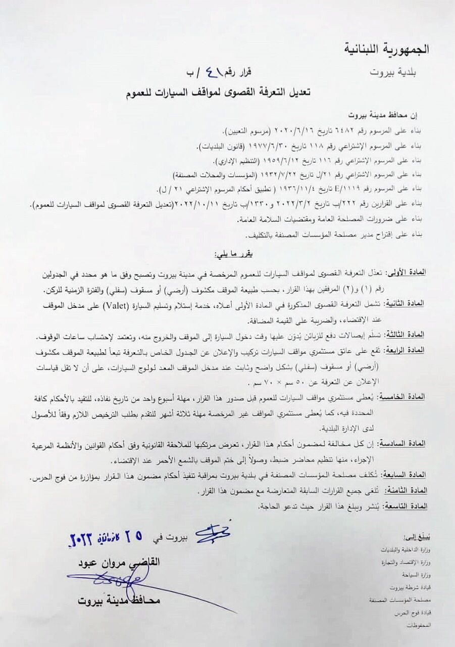 اصدر محافظ مدينة بيروت القاضي مروان عبود قرارا قضى بتعديل تعرفة مواقف السيارات للعموم. واصبحت التعرفة على الشكل التالي: