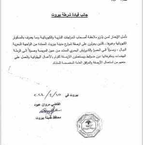 أفادت دائرة العلاقات العامة في بلدية بيروت في بيان، أن محافظ مدينة بيروت القاضي مروان عبود وجه الى قيادة شرطة بيروت في قوى الأمن الداخلي كتابا جاء فيه: