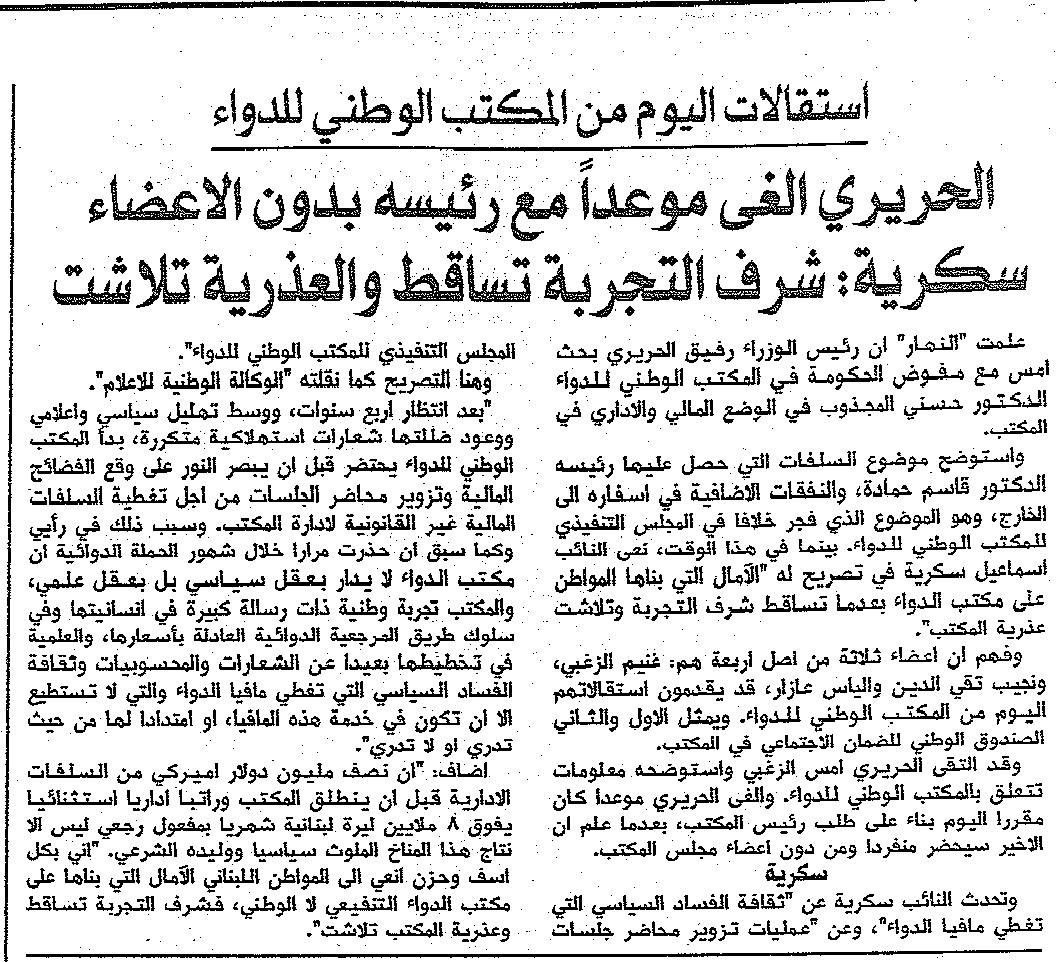 بقيت الآمال معلّقة والسلفات المالية “ماشية”. فـ”سنة 1996 ستكون سنة الثورة الحقيقية في قطاع الدواء. سنة قيام المكتب الوطني للأدوية، هذا الحلم القديم للطبقات العاملة وللمجتمع اللبناني”. بهذه العبارة أعلن وزير الصحة مروان حمادة وضع اللمسات الأخيرة على انطلاق المكتب. ومع ذلك لم ينطلق. إلا أن رئيس المكتب كان يحصل على سلف مالية على راتبه بلغت حتى العام 1996 نحو 195 مليون ليرة.