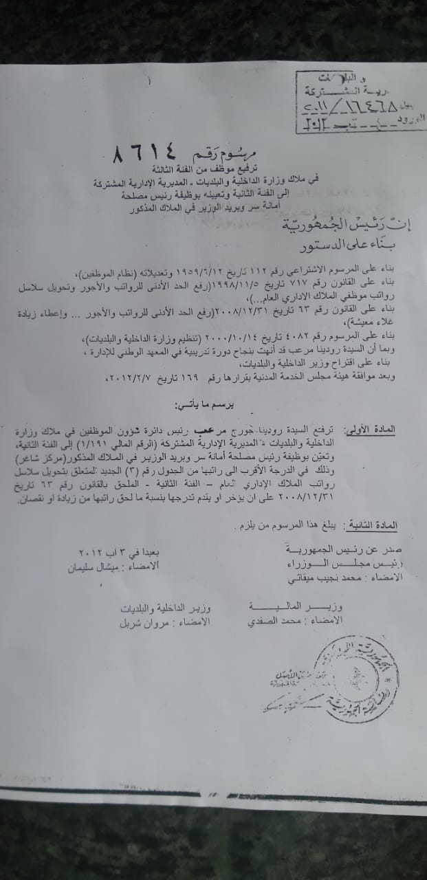 كما تم الغاء تكليف السيد انطوان روحانا بمهام أمين سر عام محافظة جبل لبنان بالإنابة والتي هي حق له كونه الاعلى رتبة في المحافظة ليتمكنوا من الحاق السيدة رودينا بالمحافظة وتكليفها بها