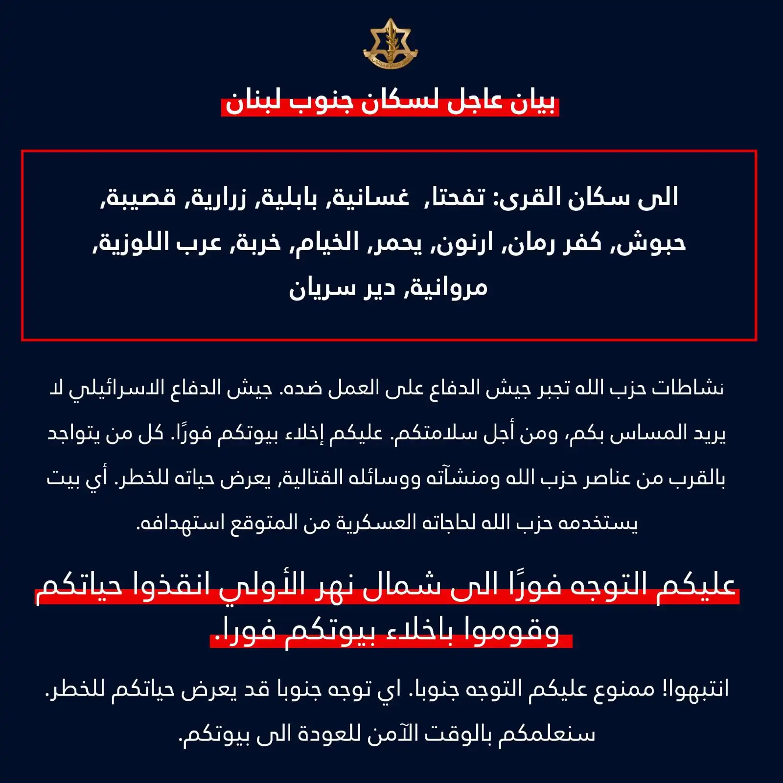 بيان عاجل إلى سكان جنوب_لبنان في القرى التالية: