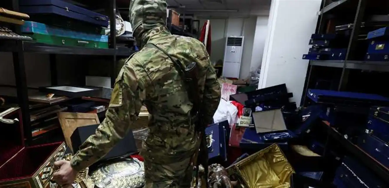 وظهر في صور نشرتها وكالة “رويترز” عناصر مسلحة وهم يبحثون في “غرفة الكنز”، حيث كانت رفوفها مكدسة بصناديق مرصعة بالذهب ولوحات وفخاريات وتذكارات في قصر الشعب بدمشق.