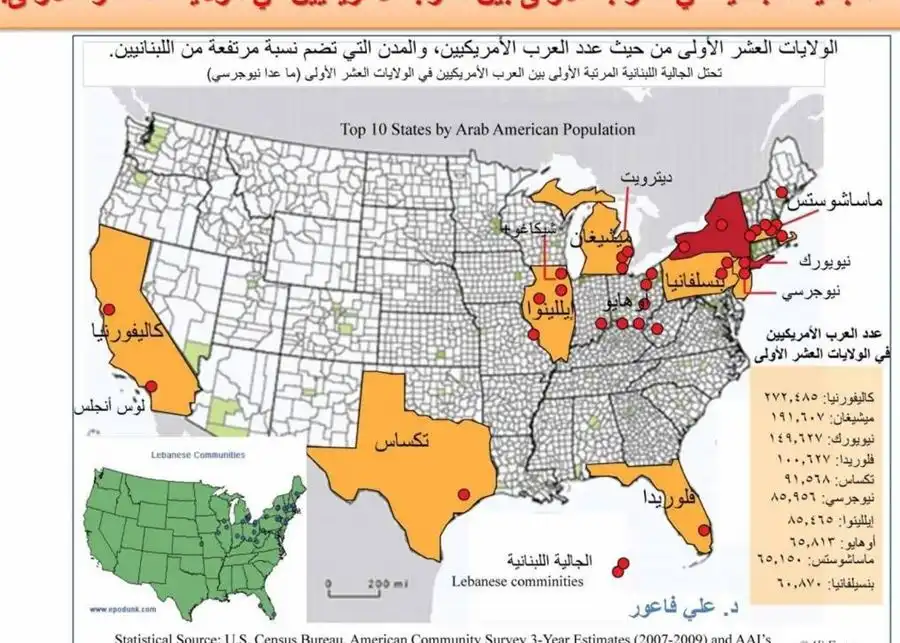 ماذا عن الشتات اللبناني في الولايات المتحدة؟ يجيب “يظهر بحسب نتائج تعداد عام 2000، أن 440,279 شخص من العرب الأميركيين في الولايات المتحدة هم من أصل لبناني. أما المدن التي تضم أكثر من ألف شخص في لائحة الأنساب وتزيد فيها نسبة من هم من أصل لبناني على 1,5%، فهي تشمل نحو 59 مدينة وناحية. ويشكل الأميركيون من أصل لبناني الجزء الأكبر من إجمالي عدد العرب الأميركيين المقيمين في معظم الولايات الاميركية، باستثناء ولاية نيو جيرسي، حيث تشكل الجالية المصرية الأمريكية أكبر مجموعة عربية”.