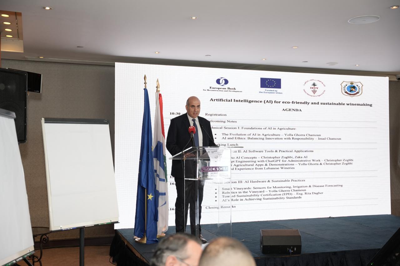 أما وزير الزراعة الدكتور نزار هاني فتحدّث قائلاً :” يتطلّب بناء مستقبل الزراعة الاستفادة من أدوات الثورة التكنولوجية وفي مقدّمتها الذكاء الاصطناعي ومن هذا المنطلق تأتي ورشة العمل اليوم لتسلّط الضوء على قطاع النبيذ وهو قطاع يتمتّع بأهمية اقتصادية وثقافية كبيرة في لبنان. نحن نؤمن بأن تطويره لا ينعكس فقط على تنشيط الاقتصاد المحلي بل أيضاً في خلق فرص عمل جديدة للشباب وتعزيز القدرة التنافسية للمنتجات اللبنانية في الأسواق المحلية والعالمية.و أضاف : ” تؤكد وزارة الزراعة التزامها الكامل بدعم هذا القطاع الحيوي وستأخذ توصيات هذه الورشة بعين الاعتبار ضمن استراتيجيتها الوطنية، كما تدعو إلى تكاتف الجهود بين كافة الشركاء من إدارات رسمية، ومنظمات دولية وجامعات وخبراء ومجتمع مدني”.
