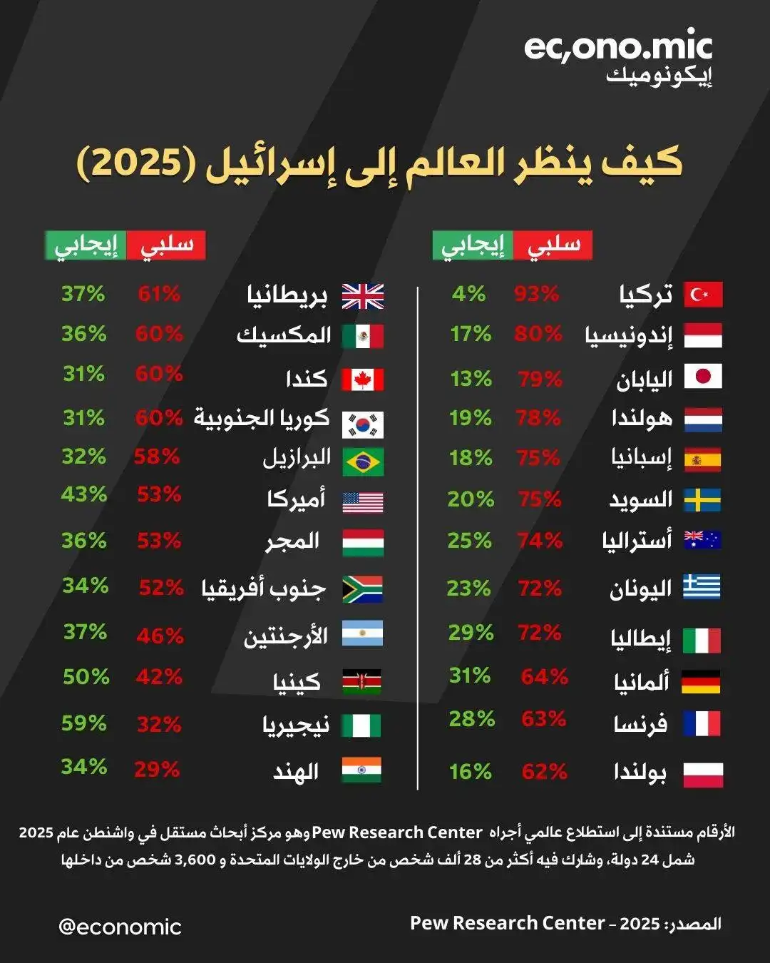 نشر مركز “بيو” الأميركي للأبحاث استطلاعا عالميا واسع النطاق أظهر تزايدا ملحوظا في المشاعر السلبية تجاه إسرائيل ورئيس وزرائها بنيامين نتنياهو في معظم دول العالم.