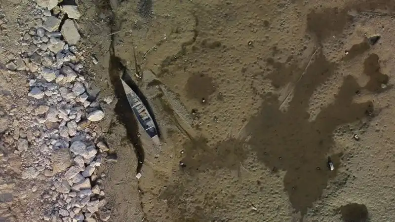 وأظهرت مشاهد مصوّرة بطائرة مسيّرة، اتساع رقعة الجفاف الذي ضرب المنطقة، إلى جانب تشققات في الأرض ووجود قوارب مهجورة تركها الصيادون بعد أن فقدت المياه التي كانت تحملها.