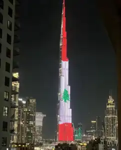 أضاءت الامارات برج خليفة بصورة العلم اللبناني في ذكرى استقلاله الثاني والثمانين.