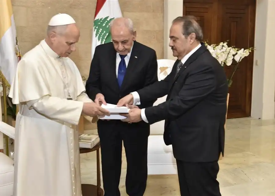 أهدى رئيس مجلس النواب اللبناني نبيه بري البابا لاوون الرابع عشر كتابًا بعنوان: “على خطى يسوع المسيح في لبنان / In The Footsteps Of Jesus, The Messiah, In Phoenicia/Lebanon”، وذلك خلال اللقاء في القصر الجمهوري في بعبدا، وفق معلومات خاصة لـ”النهار”.