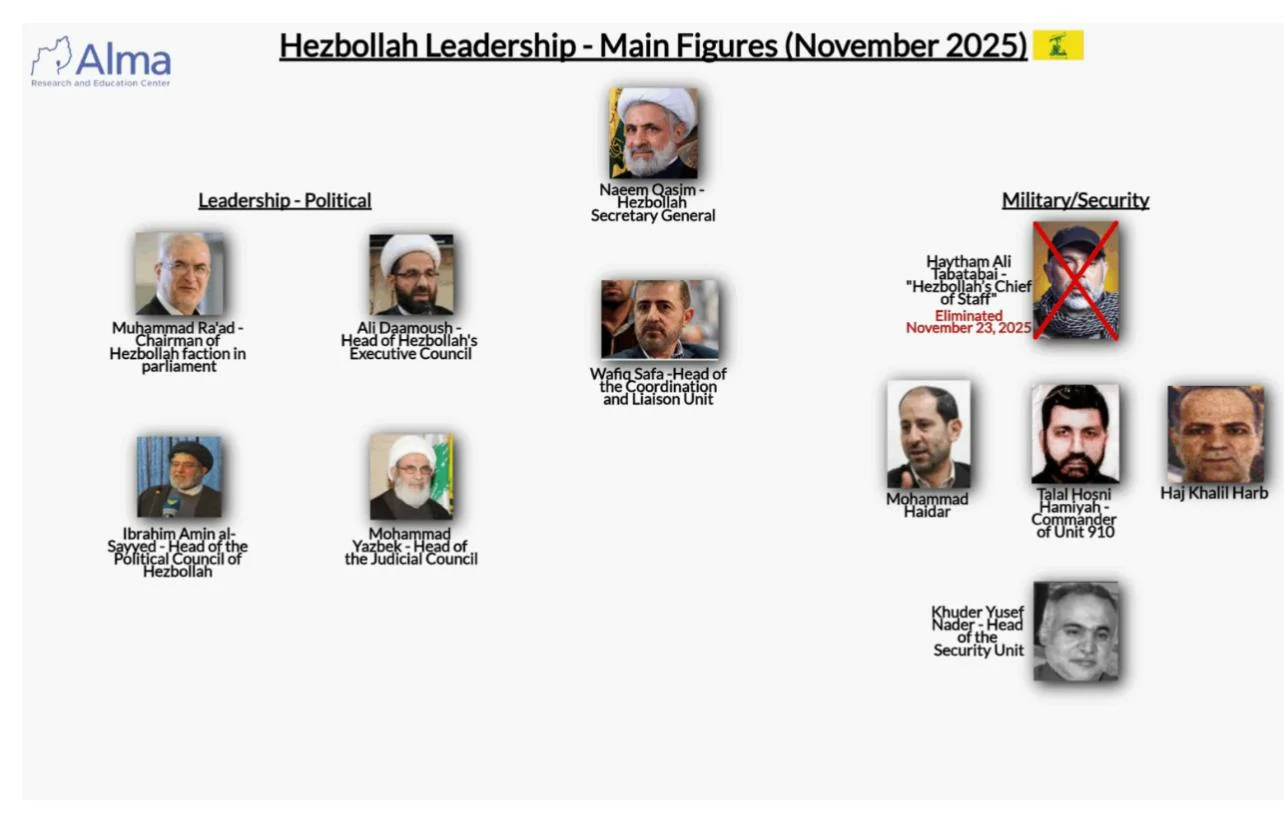 ويظهر على الصورة المنشورة، علامة “x” على صورة رئيس الأركان السابق في الحزب هيثم الطّبطبائي والذي اغتيل باستهداف في 23 تشرين الثاني/نوفمبر في الضاحية الجنوبية لبيروت.