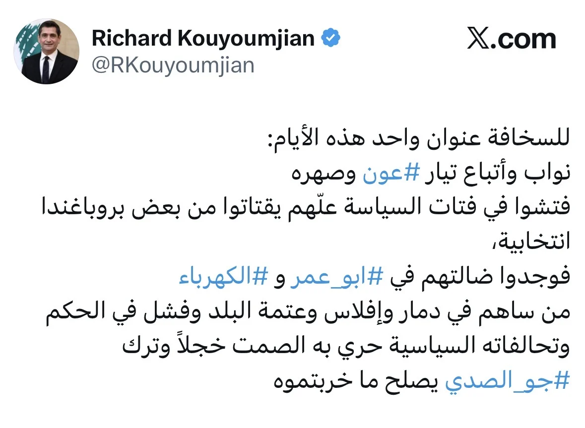 كتب رئيس جهاز العلاقات الخارجية في “القوات اللبنانية” الوزير السابق د. ريشار قيومجيان عبر حسابه على منصة “اكس”: “للسخافة عنوان واحد هذه الأيام: نواب وأتباع تيار عون وصهره، فتشوا في فتات السياسة علّهم يقتاتوا من بعض بروباغندا انتخابية، فوجدوا ضالتهم في ابو_عمر و الكهرباء”.