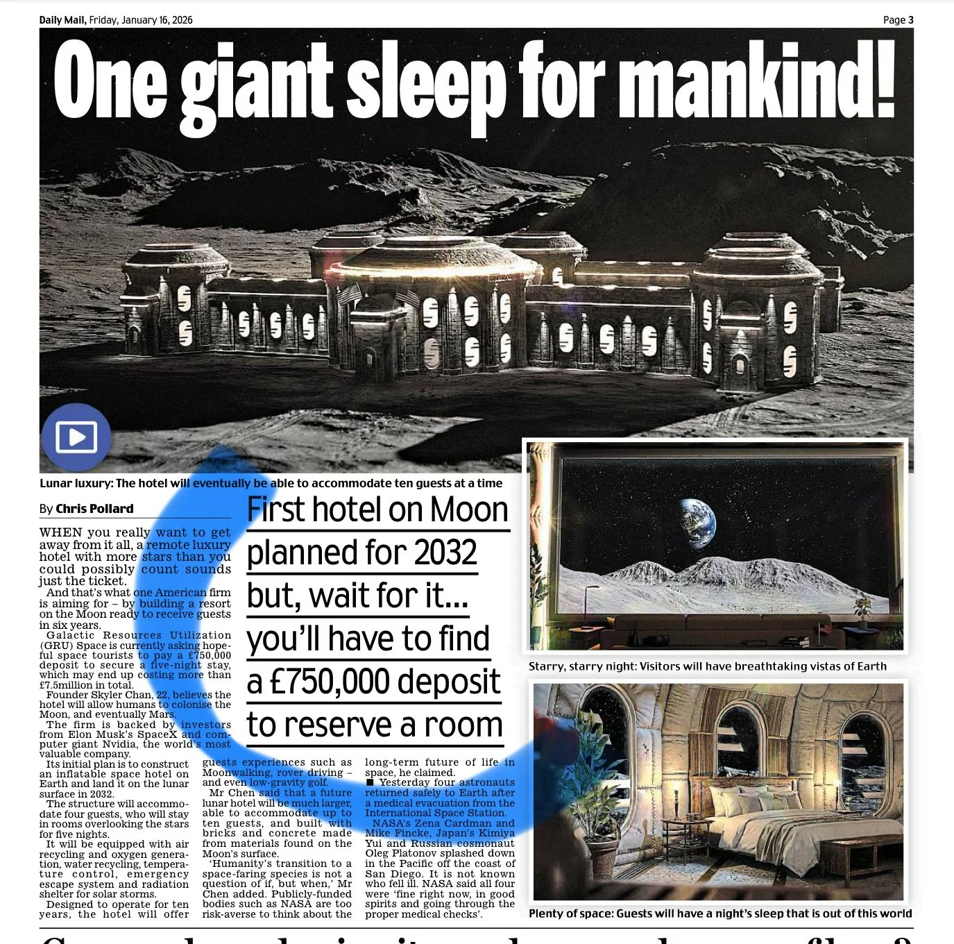 تُقدّم شركة ناشئة في كاليفورنيا للمسافرين حجزًا مبكرًا في فندق مُقترح على سطح القمر، لكنّ الحجز يتطلب دفعة أولى ضخمة قدرها مليون دولار أميركي. ومن المُتوقع أن يكون الافتتاح بعد ست سنوات.