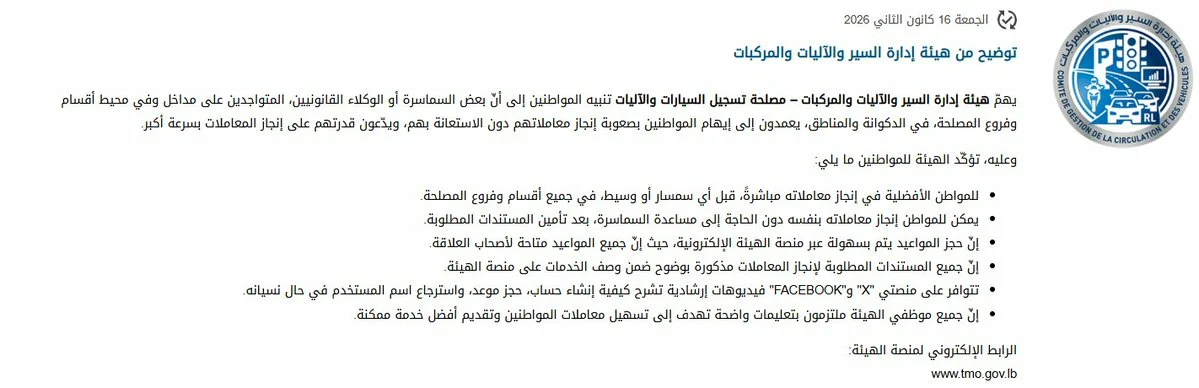 وختمت الهيئة بالتأكيد على أن المنصة الإلكترونية www.tmo.gov.lb تشكّل المرجع الرسمي الوحيد لإنجاز المعاملات وحجز المواعيد، داعية المواطنين إلى عدم الانجرار خلف أي ادعاءات مضلّلة.