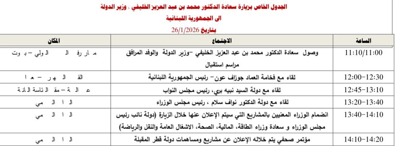 تجدون في الصورة المرفقة، ما يتضمّنه جدول زيارة وزير الدولة القطري محمد بن عبد العزيز الخليفي الى لبنان.