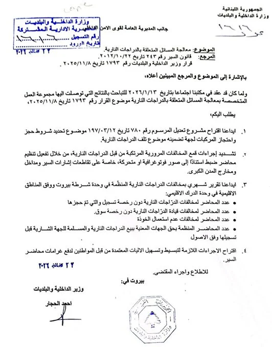كما تضمّن التعميم توجيهًا بإعداد تقارير شهرية مفصّلة عن مخالفات الدراجات النارية، سواء في وحدة شرطة بيروت أو في وحدات الدرك الإقليمي، على أن تشمل عدد المحاضر المنظّمة بحق الدراجات غير المسجّلة، والمخالفات المرتبطة بالقيادة دون رخصة سوق، وعدم استعمال الخوذة، إضافة إلى المخالفات العائدة لدراجات تم تسليمها من قبل جهات معنية قبل تسجيلها وفق الأصول.