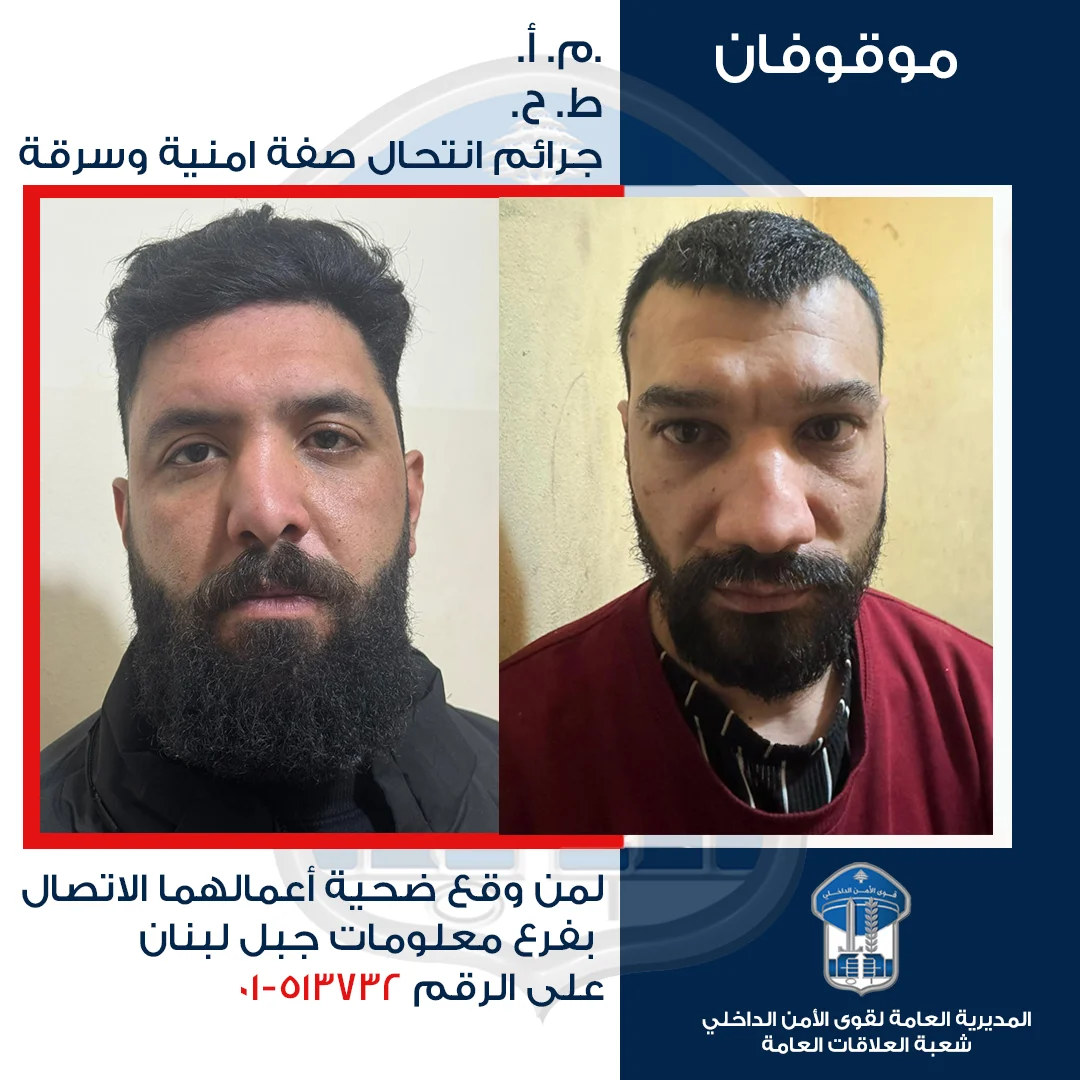 لذلك، وبناءً على إشارة القضاء المختص، تُعمّم المديريّة العامّة لقوى الأمن الداخلي صورة الموقوفَين، وتطلب من الذين وقعوا ضحيّة أعمالهما الحضور إلى فرع معلومات جبل لبنان، أو الاتّصال على الرقم: 513732-01، تمهيدًا لاتّخاذ الإجراءات القانونيّة اللازمة” .