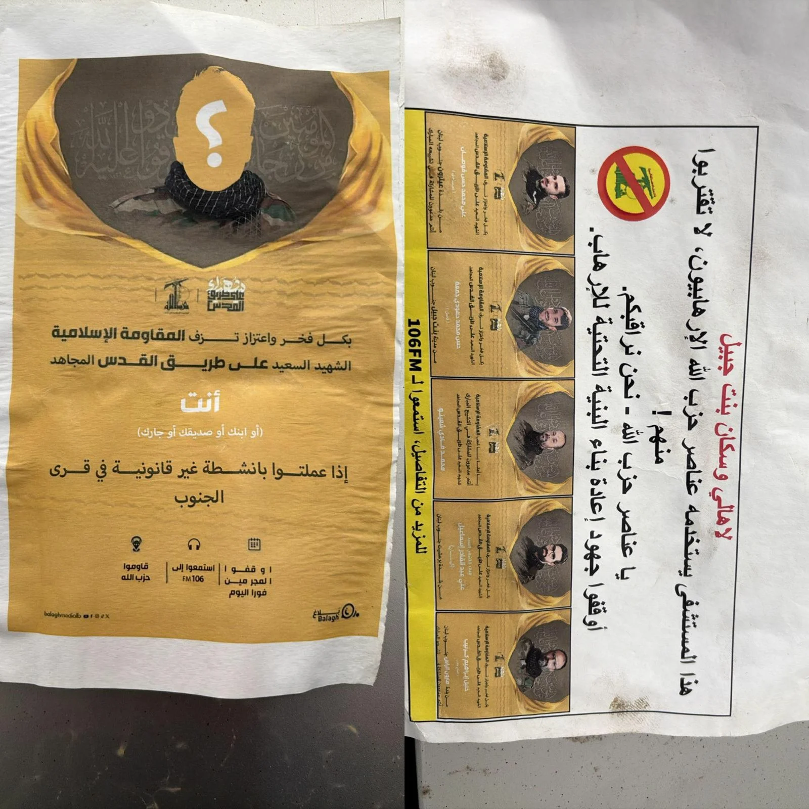 حيث جاء في المناشير : بكل فخر واعتزاز تزف المقاومة الاسلامية الشهيد السعيد على طريق القدس المجاهد “أنت” أو “ابنك” او “صديقك” او “جارك”، اذا عملت بانشطة غير قانونية في قرى الجنوب.