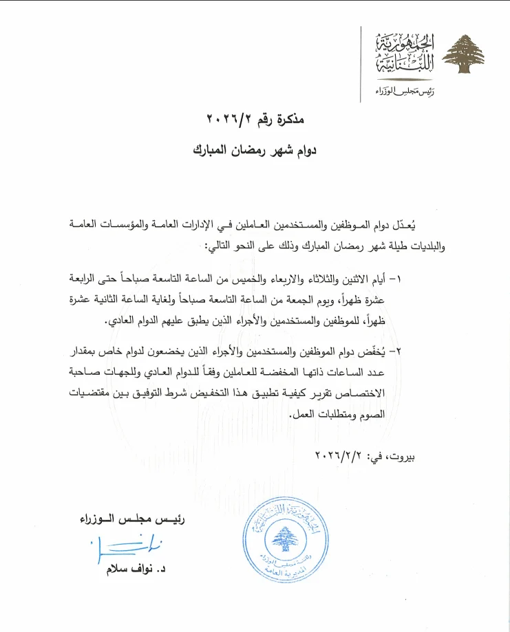 كما أعلنت رئاسة الحكومة تعديل دوام الموظفين والمستخدمين العاملين في الإدارات العامة والمؤسسات العامة والبلديات طيلة شهر رمضان المبارك وذلك على النحو التالي: