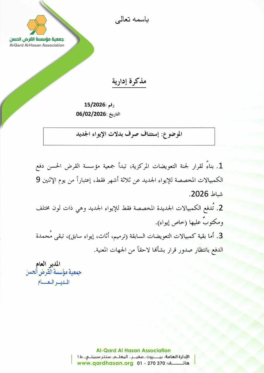 Hala Kabban2026-02-06T10:45:41+02:00بالصورة- تعميم صادر عن القرض الحسن حول دفع بدل إيواء جديدHala Kabban2026-02-06T10:45:41+02:006 شباط 2026|
