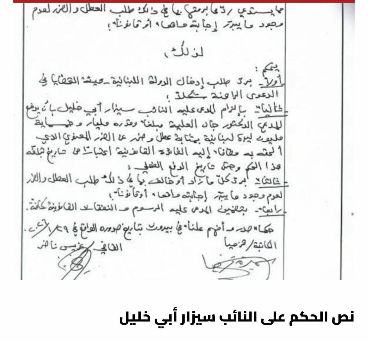 صدر الحكم في الادّعاء المقدَّم من رئيس هيئة الشراء العام جان العلية على النائب سيزار أبي خليل، فقضى بإلزام الأخير دفع مبلغ مليار و500 مليون ليرة بمثابة عطل وضرر.