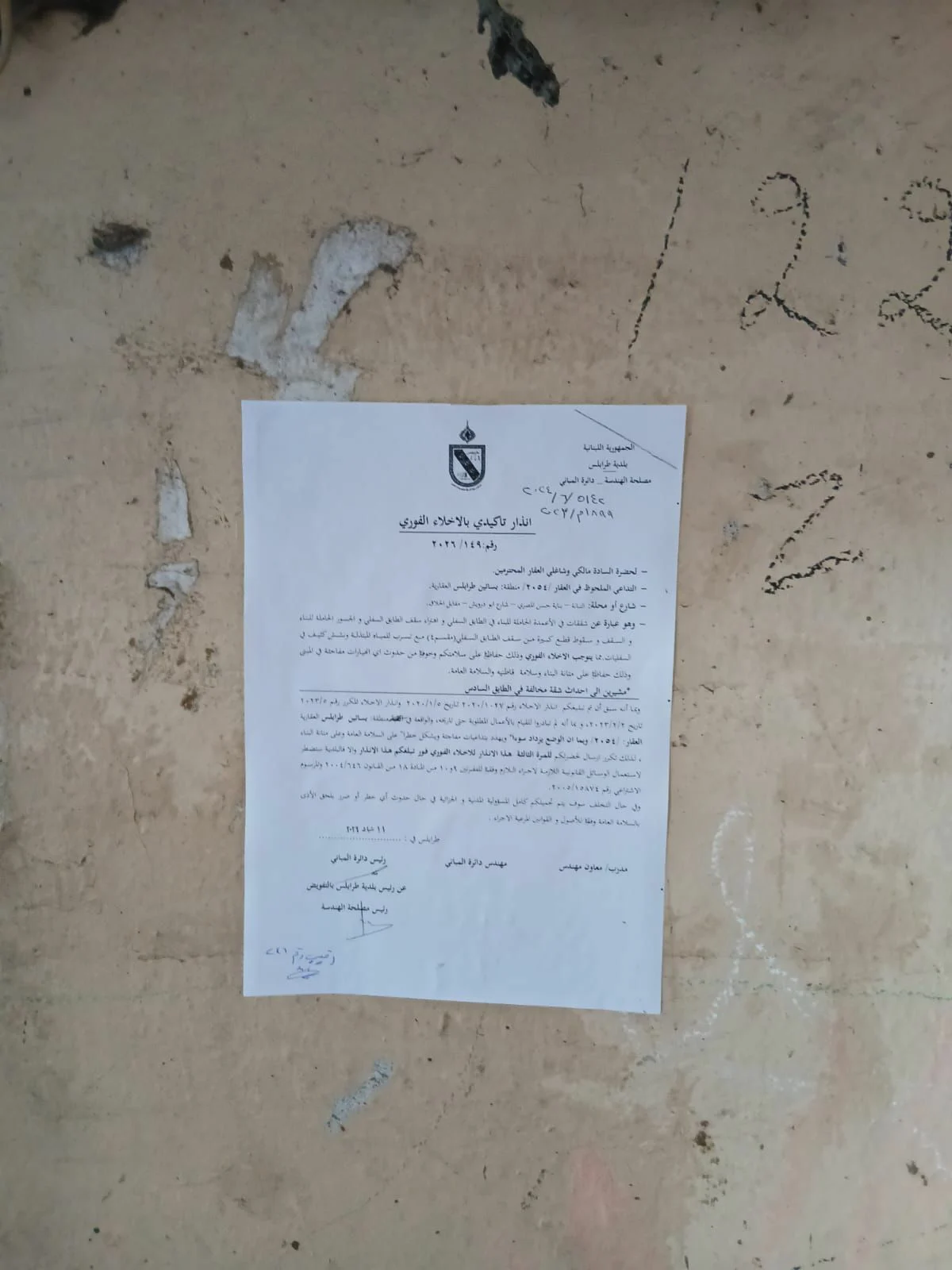 بالصورة- قرار بالإخلاء الفوري لمبنى المصري في التبانة
