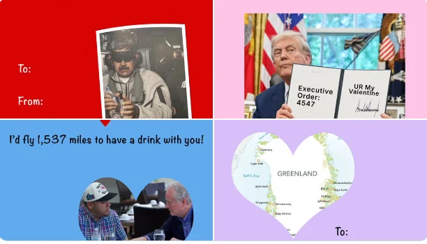 نشر البيت الأبيض سلسلة بطاقات رقمية بمناسبة عيد الحب، حملت طابعاً سياسياً ساخراً، وتناولت قرارات وأحداثاً بارزة خلال الولاية الثانية للرئيس الأميركي دونالد ترامب.