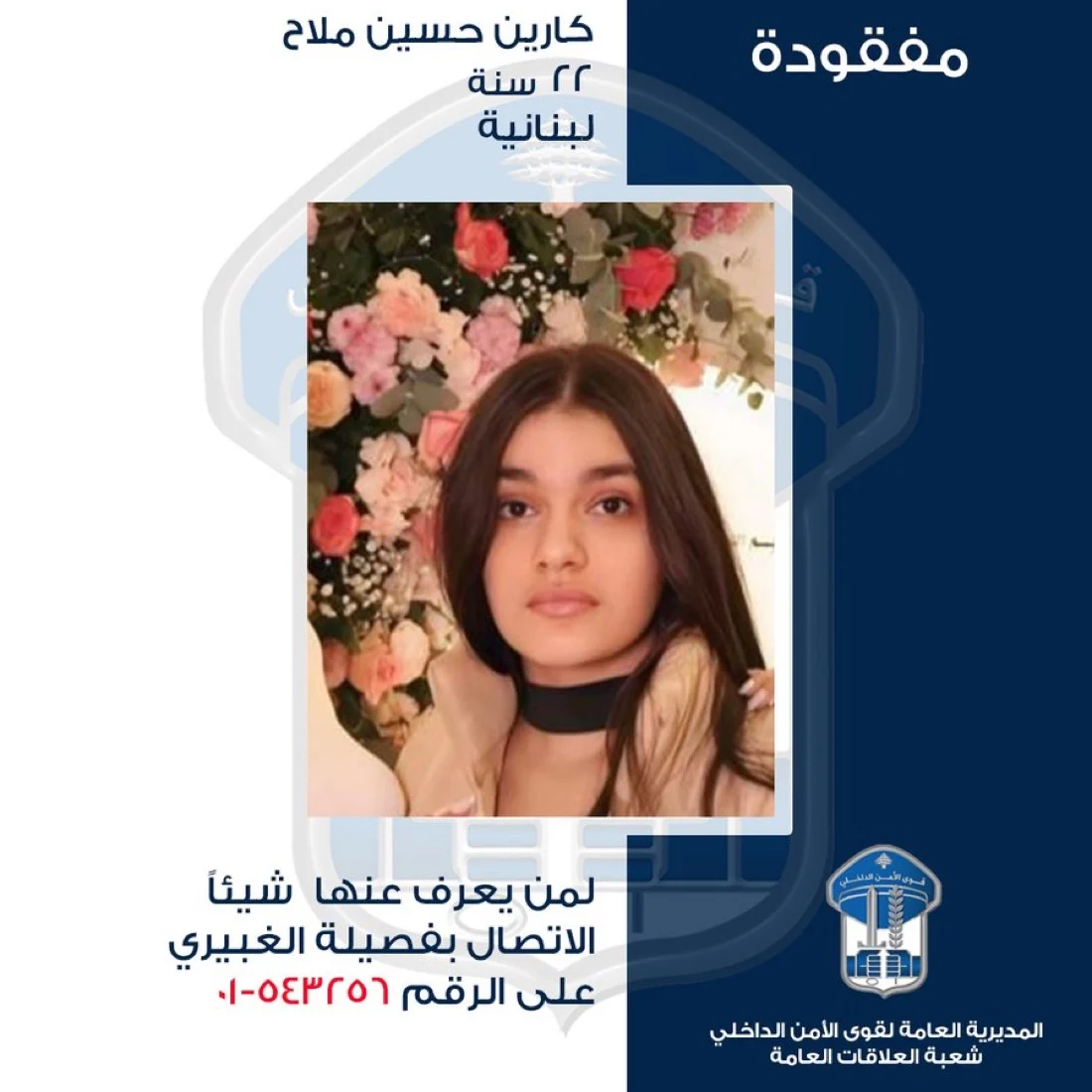 تُعمِّم المديريّة العامّة لقوى الأمن الدّاخلي، بناءً على إشارة القضاء المختص، صورة المفقودة: