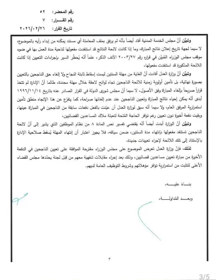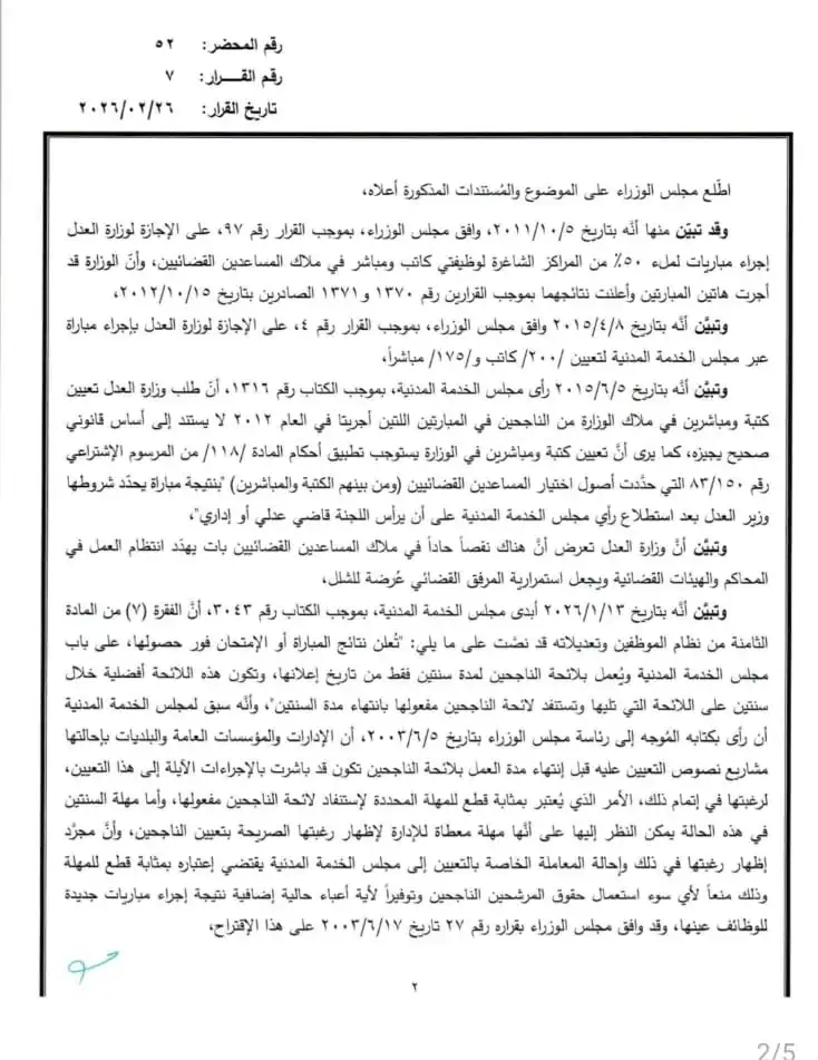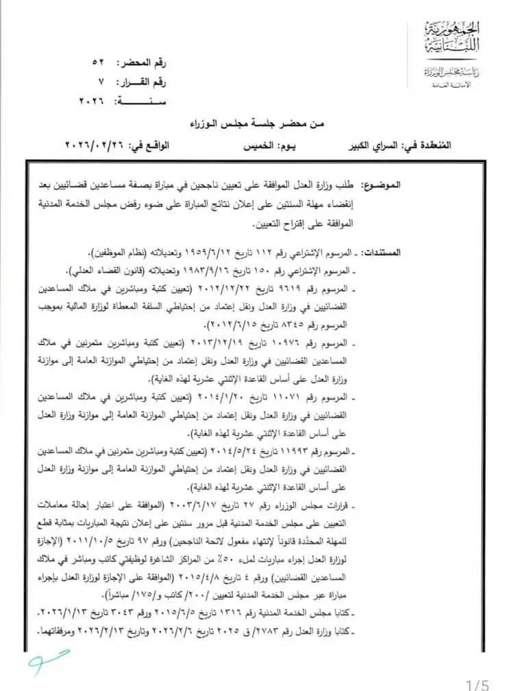 قرّر مجلس الوزراء في جلسته التي عقدت اليوم، تعيين 100 من الناجحين في الدفعة الأخيرة من المباراة التي أجريت لتعيين مساعدين قضائيين.