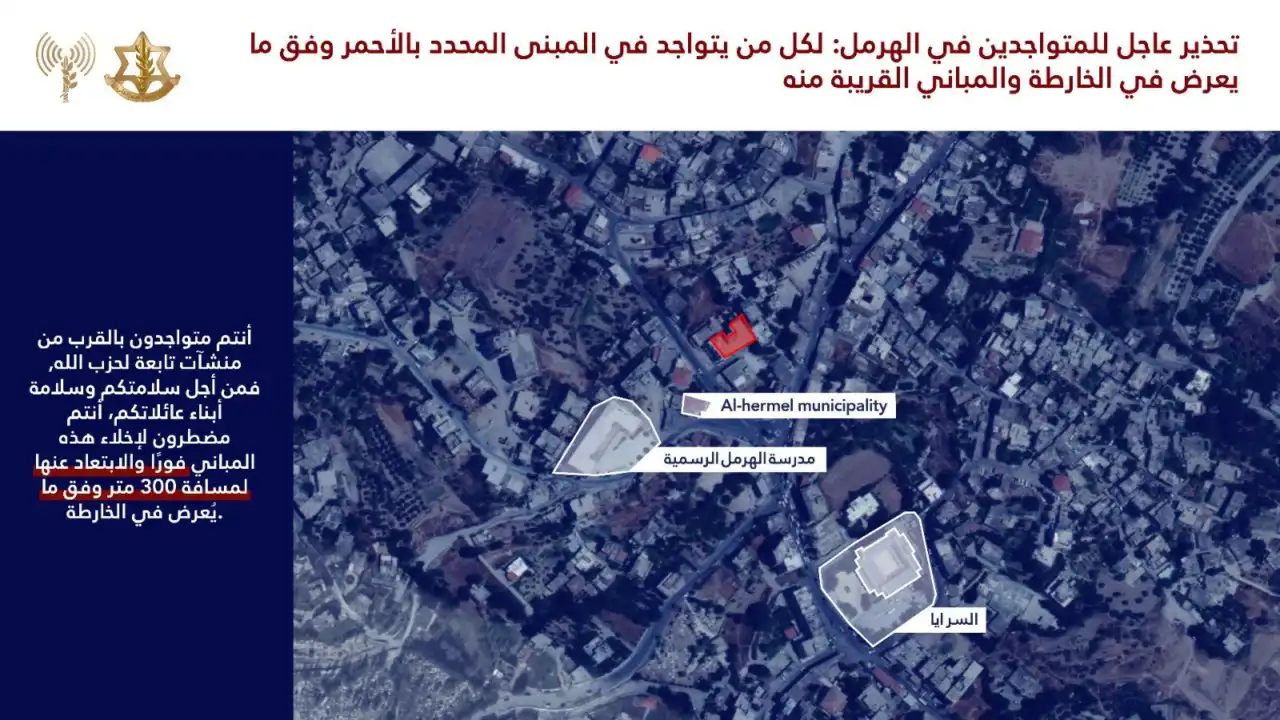 🔸نحث سكان المباني المحددة بالأحمر في الخرائط المرفقة والمباني المجاورة لها: أنتم تتواجدون بالقرب من مباني يستخدمها حزب الله الإرهابي فمن أجل سلامتكم أنتم مضطرون لإخلائها فورًا والابتعاد عنها لمسافة لا تقل عن 300 متر