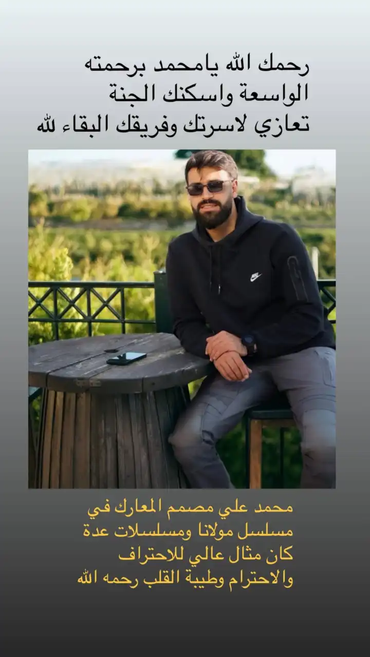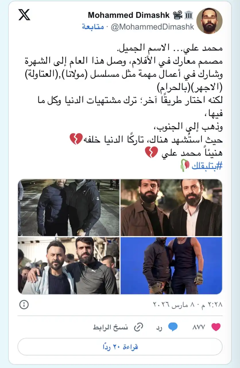 وتابع: “محمد علي مصمّم المعارك في مسلسل “مولانا” ومسلسلات عدّة، كان مثالاً عالياً للاحتراف والاحترام وطيبة القلب. رحمه الله”.