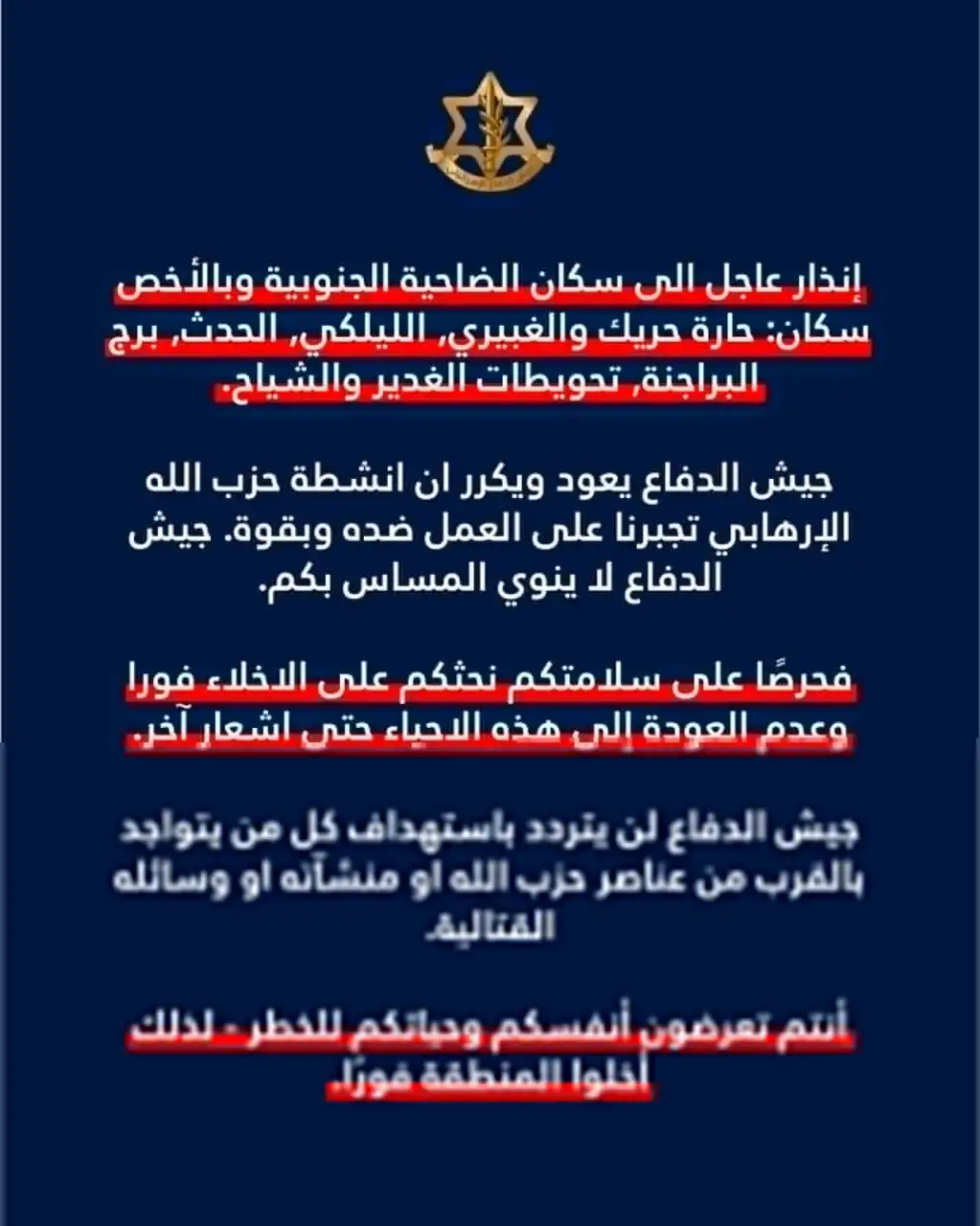 وجّه المتحدث باسم الجيش الإسرائيلي أفيخاي أدرعي إنذارًا عاجلًا لسكان الضاحية الجنوبية لبيروت، وبالأخص سكان: