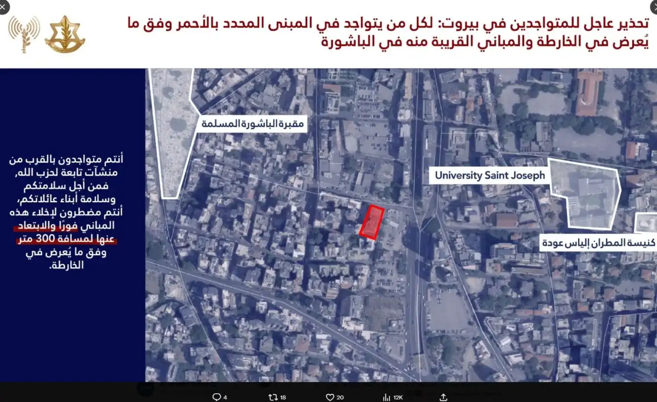وجّه الجيش الإسرائيلي إنذارًا عاجلًا إلى سكان بيروت، وتحديدًا حي الباشورة، داعيًا كل من يتواجد في مبنى محدد على الخريطة المرفقة والمباني المجاورة له إلى الإخلاء فورًا.