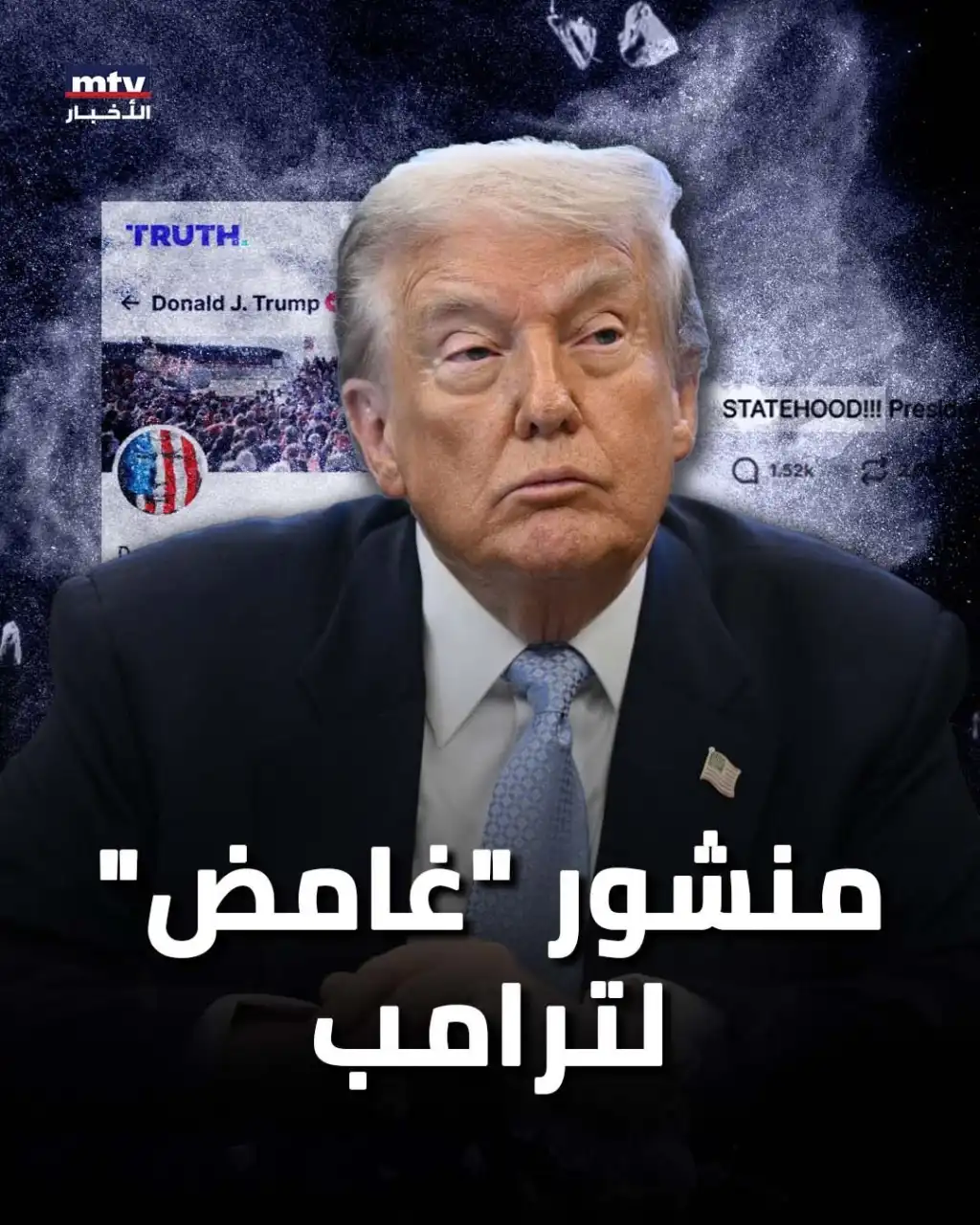 -أثار الرئيس الأميركيّ دونالد ترامب موجة من التكهّنات، بعدما دوّن منشورًا غامضًا من كلمة واحدة هي STATEHOOD أو “قيام الدولة”، من دون أي توضيح إضافيّ.