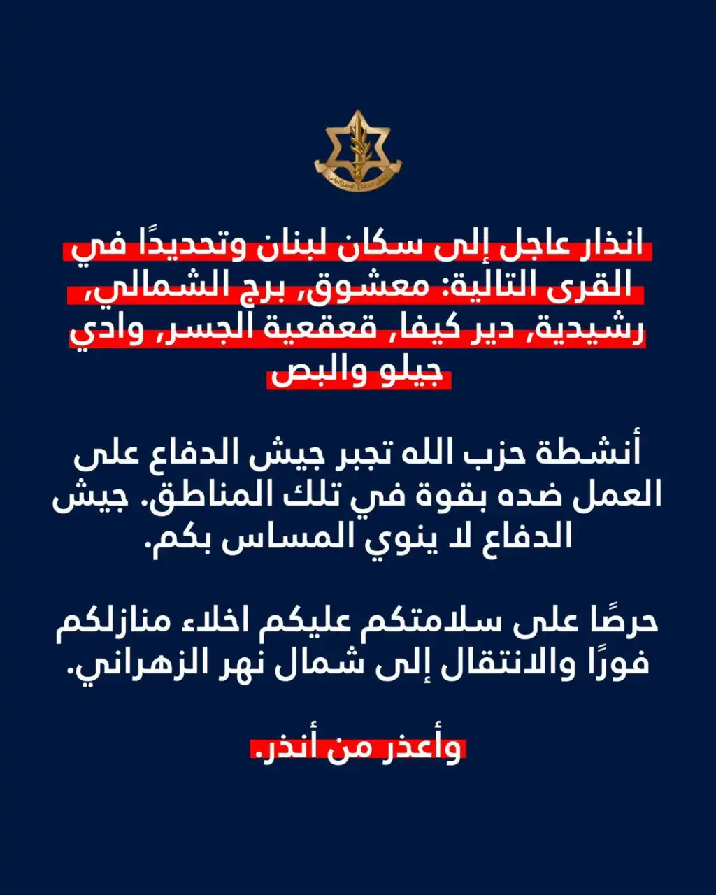 الجيش الإسرائيلي: إنذار عاجل لسكان معشوق وبرج الشمالي والرشيدية ودير كيفا وقعقعية الجسر ووادي جيلو والبص لإخلاء منازلهم فورًا والتوجه شمال نهر الزهراني