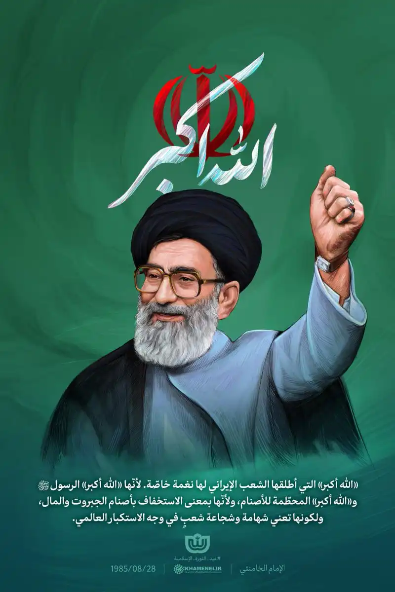 والصورة تُظهر خامنئي رافعًا يده بإشارة نصر، وخلفه العلم الإيراني، فيما تتوسط عبارة “الله أكبر”.