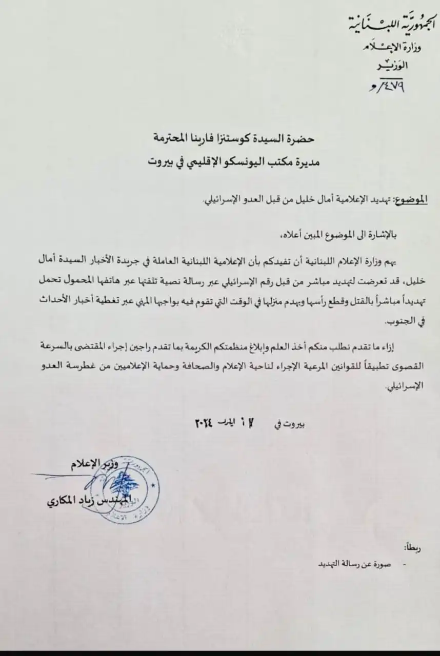 نشر وزير الإعلام السابق زياد المكاري على منصة “أكس”، الرسالة التي وجهها الى مديرة مكتب اليونيسكو الاقليمي في بيروت، كوستانزا فارينا، في تاريخ ١٧ ايلول ٢.٢٣، حين تلقت الصحافية آمال خليل اتصالاً من رقم إسرائيلي يهددها بالقتل وتحديداً بـ”قطع رأسها” وهدم منزلها، طالباً أخذ الاجراءات الدولية اللازمة لحماية الصحافيين.